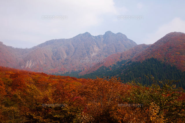 秋山郷の紅葉と苗場山 の写真素材 イラスト素材 アマナイメージズ